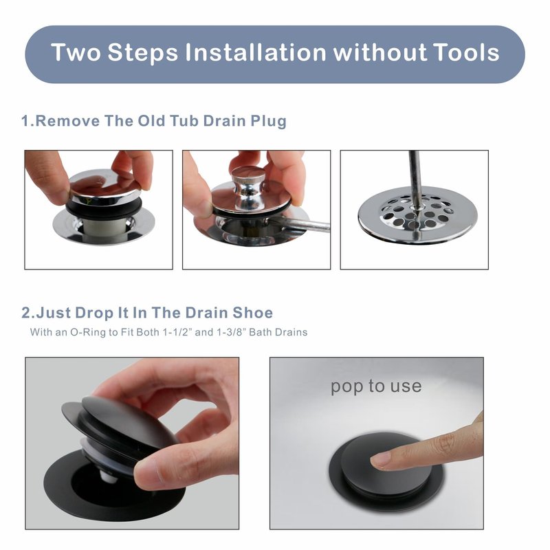 - Universal Compatibility: The Hidrop universal black tub drain tip toe bathtub drain stopper is compatible with most lift and turn, tip toe, and trip lever drains, making it a versatile choice for your bathroom.With O-rings to fit both 1- 1/2“ and 1-3/8" bath drains. (Please measure your tub drain hole before purchasing)