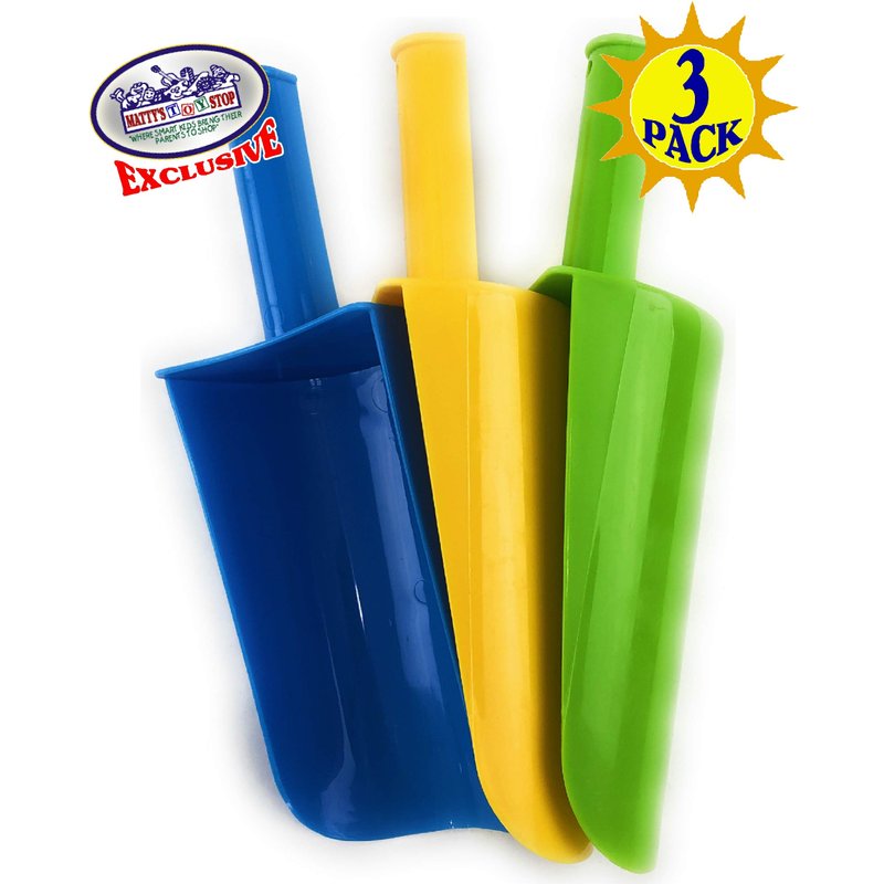 - Complete Set of 3 (9") Sturdy Plastic Short Handle Scoop Shovels! Complete gift set bundle comes with 1 yellow, 1 blue & 1 green shovel - 3 total!