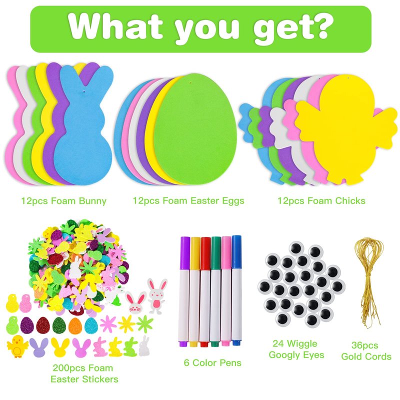 - Easter Foam Stickers Set: 200pcs Foam Easter Stickers, 12pcs Foam Easter Eggs, 12pcs Foam Bunny, 12pcs Foam Chicks, 36pcs Gold Cords, 24 Wiggle Googly Eyes and 6 Color Pens (Purple, Red, Yellow, Green, Blue, Pink) in a box.