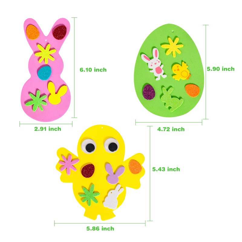 - Suitable size for kids: The foam egg size is approx. 5.90 x 4.72 inches, bunny is 6.10 x2.91 inches; Chick is 5.86 x 5.43 inches; Egg Bunny Chick with 6 colors ( Pink, Green, Purple, Yellow, Blue and White ), you can draw or write something on blank area.