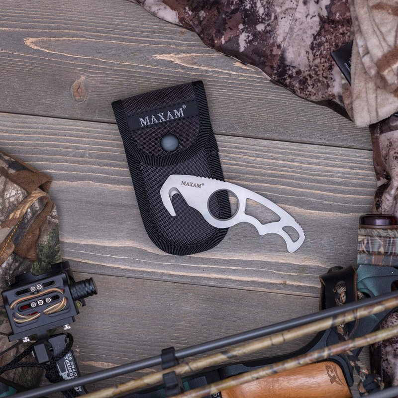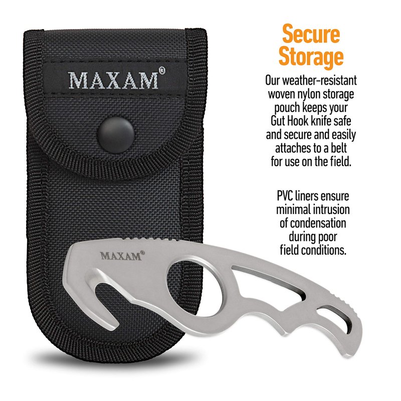 Maxam Gut Hook & Sheath - Hunting Knife for Gutting & Skinning Deer, Elk, Hogs, Cutting Fishing Lines, Lift Hot Grates - Stainless Steel Blade with Pouch - Outdoor Survival Gear for Hunters - 5-inch
