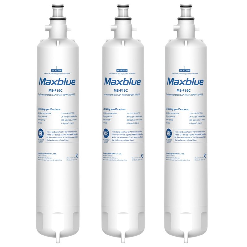Maxblue Replacement for RPWFE (with CHIP) Refrigerator Water Filter, Replacement for GE RPWFE, RPWF, WSG-4, DWF-36, WF277, R-3600, MPF15350, OPFG3-RF300, RWF1063, RWF3600A. Replacement for models: GE RPWFE, WSG-4, DWF-36, WF277, R-3600, MPF15350, OPFG3-RF300, RWF1063, RWF3600A. Authoritative NSF certified: Maxblue refrigerator water filter is NSF 42 and 372 certified to reduce a wide range of harmful substances in water, and also certified by authoritative NSF 372 for lead-free materials. Multiple certifications confirm product quality and effect. Perfect fit: The built-in chip in the filter is perfect fit with the refrigerator with no worries about misinformation. Meanwhile, our professional research team makes effort to produce perfect fit refrigerator filters with exquisite engineering design without water leakage issues. Brilliant filtration: Our filter can effectively reduce various heavy metals, cadmium, THM, VOCs, chlorine, odor, and other impurities, which has precise filtration effect to provide safe and purified drinking water for you and your family. The data is tested by a third-party lab