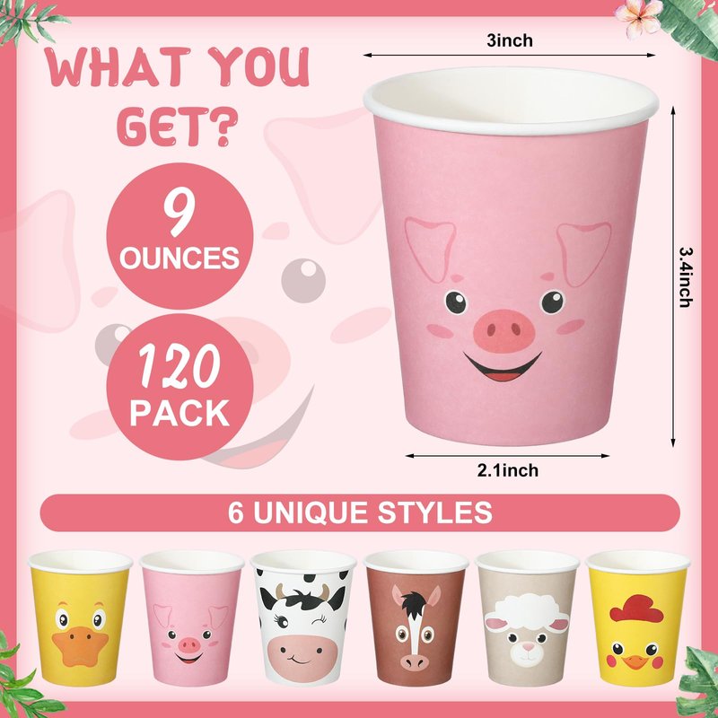 - Abundant Volume and Versatile Functionality: dive into the party merriment with our pack of 120 pieces of farm animal disposable cups for party; Featuring 6 delightful animal designs with 20 of each type, these cups are not just for drinking purposes, but they also double up as snack cups, gift cups, decorations or photo props adding more charm and vibrancy to your parties while creating unforgettable memories