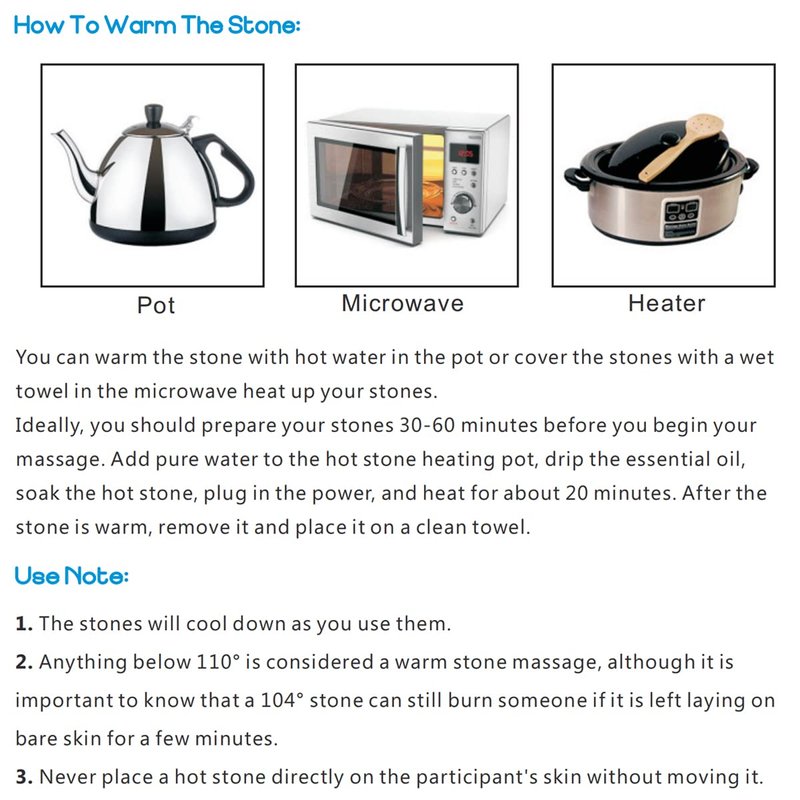- KEEP BEAUTY: Use these massage stones with essential oils for better effect. Be careful not to place hot stone on your skin immediately after heating, you can wrap it in a towel to avoid burns.