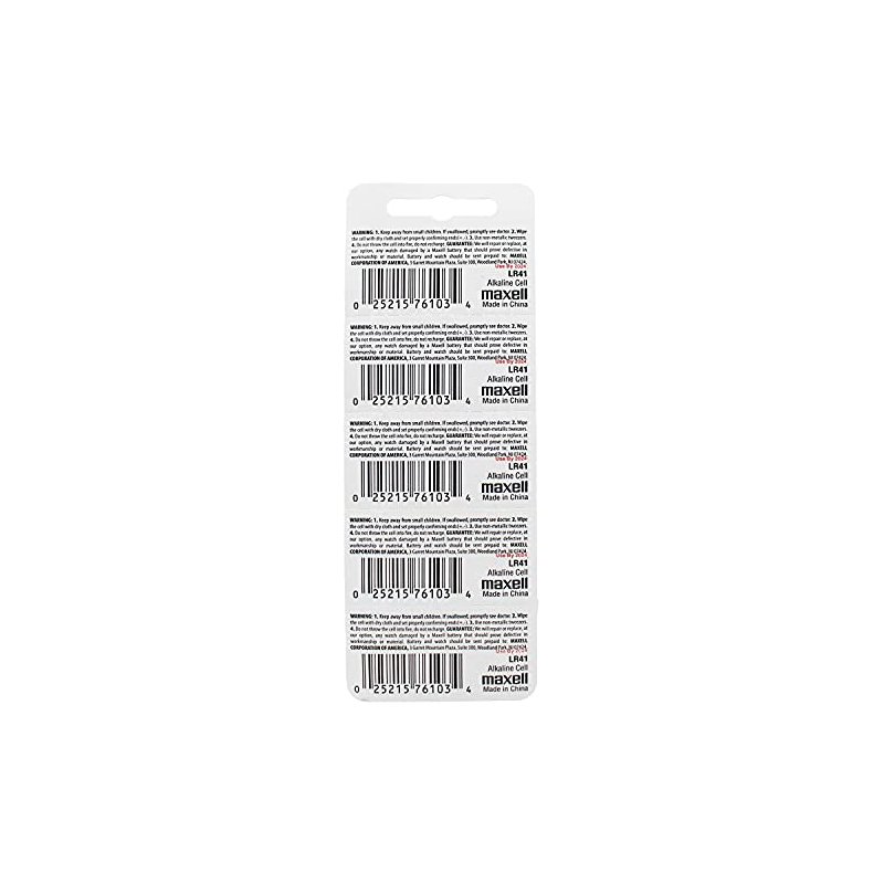 Brand MAXELL Model LR41 Quantity 20 pieces Color Orange + Silver Material Alkaline Specification Cell type Alkaline Model LR41 Head type Flat Top Voltage 1.5V Rechargeable Non-rechargeable Non-rechargeable Built-in protected circuit No overvoltage protection No short circuit protection No overload protection No protection against over discharge Mercury free Yes Dimensions and weight Weight 0.0 88 oz (88 oz) 0.88 oz) Packing List 20 button batteries