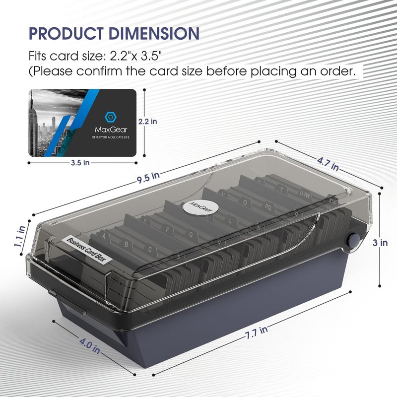 MaxGear business card organizer for desk Large Capacity: Business card organizer can hold up to 500 business cards, fits card size: 2.2" x 3.5". Not include or suitable for Rolodex Cards. This name card case's dimension is 9.5 x 4.8 x 3 inches. Careful Design: The transparent lid of the business card storage box can be opened easily for you to access your business cards at any moment. And the lid will keep dusts away to protect your business cards. Alphabetical Tabs: Business card holder with fixed dividers and A-Z alphabetical index tabs for organization and quick search. Practical & Time-Saving: This large business card case is perfect for storing and organizing business cards. A great office tool for business elites. Customer Service: 12-Months After-Sales Service. If you have any questions, please feel free to contact with us. With nothing to worry about, try it today! Application: Designed for every business man or office workers who deal with plenty of business cards. Great business card organizer for protecting your business cards well and keep desk tidy. Good assistant to collect business cards in trade exhibition/ school/ office/ hotel.