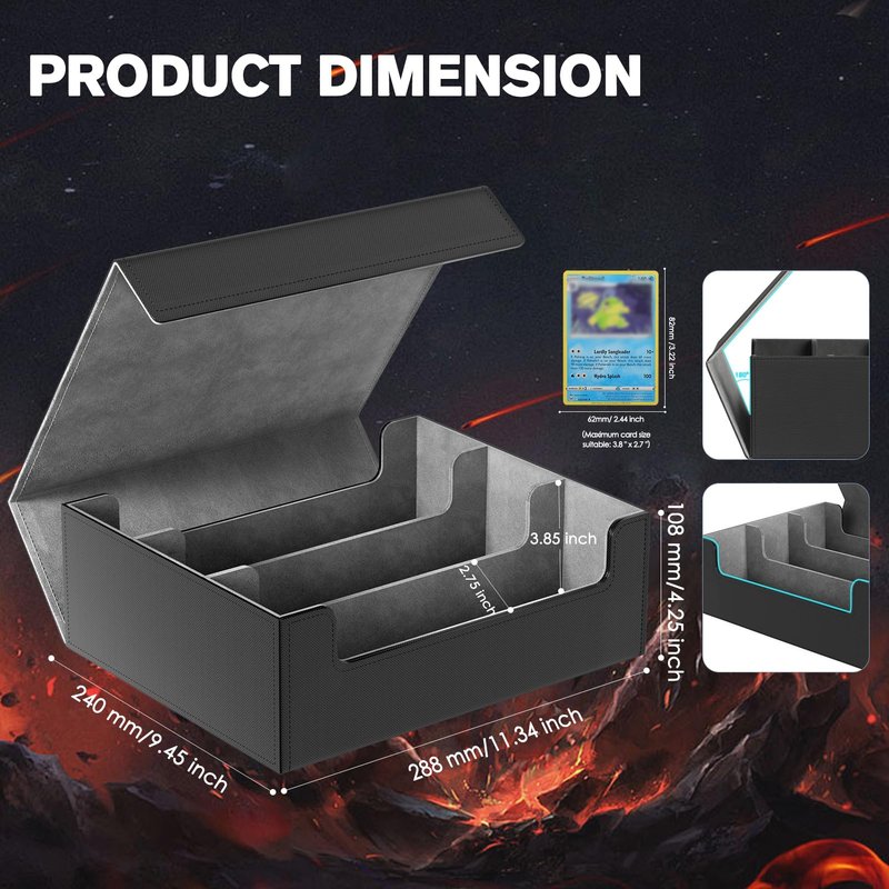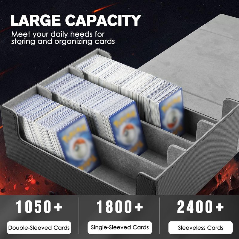 - Holds 1800+ Sleeved Cards: Our deck card box measures 11.34 x 9.45 x 4.25 inches, offering ample space to store over 1800 single-sleeved trading game cards. Please note that it is not suitable for top-loading sleeves and confirm your card size before placing an order. (Maximum unsleeved card size suitable: 3.8" x 2.7")