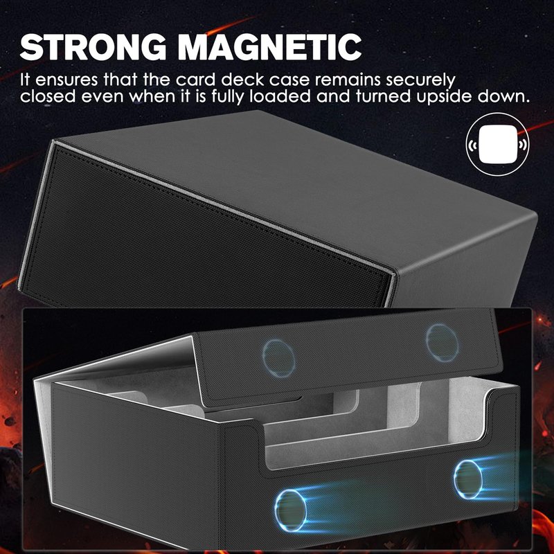 MaxGear Card Deck Box for Trading Cards Our deck card box measures 11.34 x 9.45 x 4.25 inches, offering ample space to store over 1800 single-sleeved trading game cards. Please note that it is not suitable for top-loading sleeves and confirm your card size before placing an order. (Maximum unsleeved card size suitable: 3.8" x 2.7") Our card case is compatible with various types of standard cards, including baseball cards, basketball cards, football cards, hockey cards, sports cards, and more. Our card case features a strong magnetic closure that keeps the lid securely closed, even when the box is turned upside down. This ensures that your cards remain undamaged and prevents them from accidentally falling out. The secure design allows for efficient card organization and storage. Our card case is made of high-quality materials with a waterproof exterior and a soft microfiber lining. This ensures superior protection for your cards, shielding them from scratches and creases. This card sleeve box makes a perfect gift for friends who enjoy collecting cards, their cards will be well-organized and protected. If you have any questions, please feel free to contact us. With nothing to worry about, try it today!