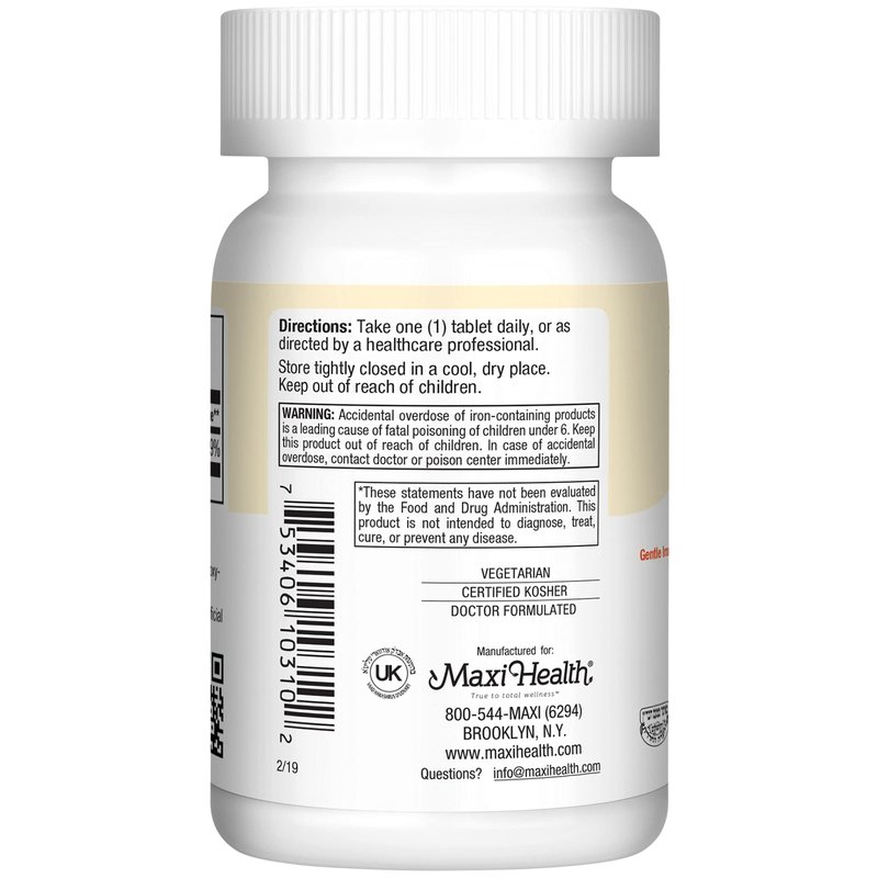 - VEGETARIAN & KOSHER CERTIFIED - Maxi is dedicated to formulating high-quality iron supplements for men & women using pure and natural ingredients that are certified Kosher. Contains no parabens, soy, wheat, salt, gluten, milk, artificial flavors, colorings, or preservatives.