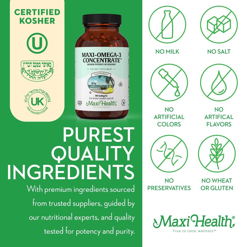 - WILD-CAUGHT & KOSHER : Every batch of Maxi Health omega3 fish oil supplements is crafted from fresh, wild-caught ocean fish rich in omega 3 fatty acids. Kosher Certified by the Udvari Kashruth (UK), the Orthodox Union (OU), and the Badatz.