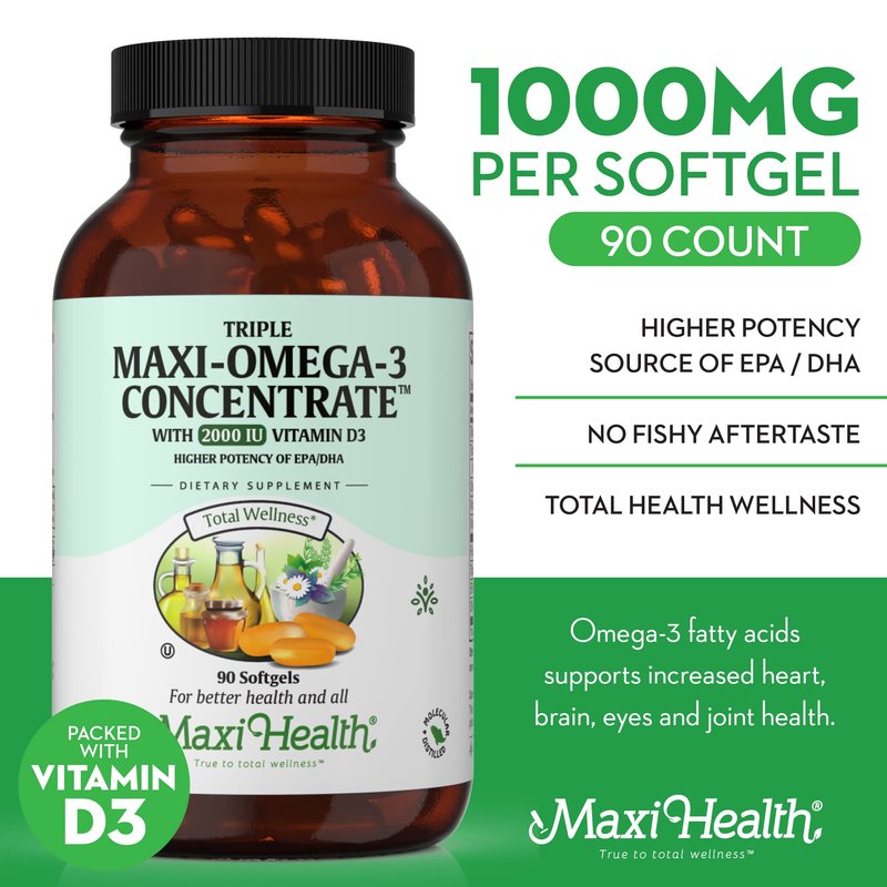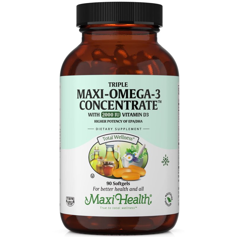 Maxi Health Omega 3 Supplement - Omega-3 Fish Oil Triple Concentrate w/ Vitamin D3 - Potent Source of EPA / DHA Fatty Acids - Heart, Brain, Joint Health - Kosher Wild Caught Marine Fish - 90 Softgels