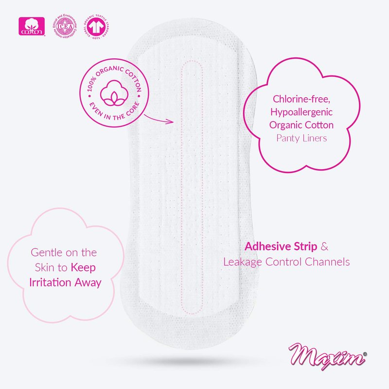 Maxim Organic Cotton Pantiliners Sanitary Pads - 3 Packs, Thong-Lite Style, Biodegradable, Ultra-Comfort, Hypoallergenic, Eco-Friendly, Dual-Use, Secure Fit, 105 Count