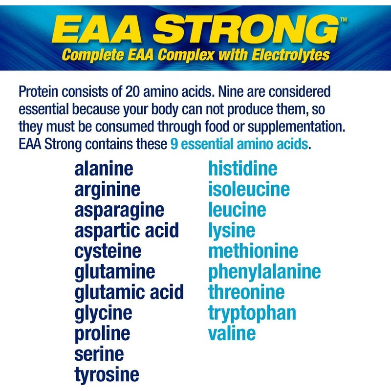 - Your complete and clean amino acid supplement: EAA strong is made from vegan fermented EAA's and contains no dyes. It mixes Instantly and is easy and convenient to use.