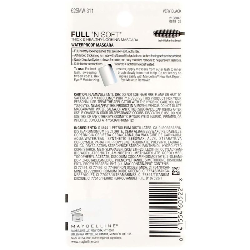 Maybelline's Full 'N Soft Mascara builds full, healthy-looking lashes without the brittle feel. The unique formula prevents loss of lashes with a Quick Dissolve System that allows easy mascara removal. The advanced thickening formula with Vitamin E helps to soften and nourish lashes without any clumps or globs. Let your eyes do all the talking with a lash look that speaks volumes.