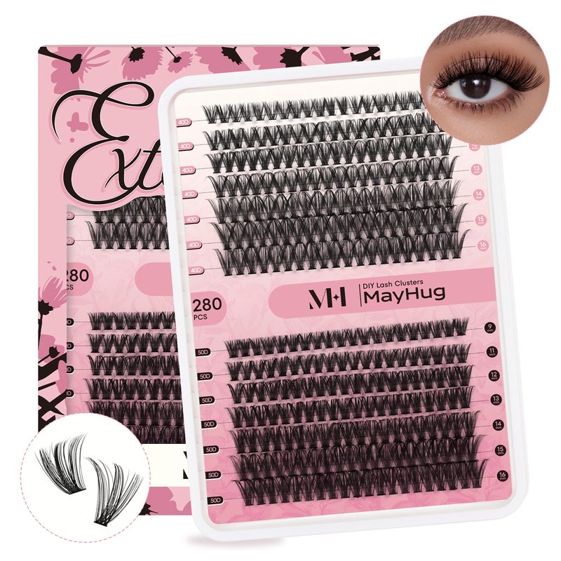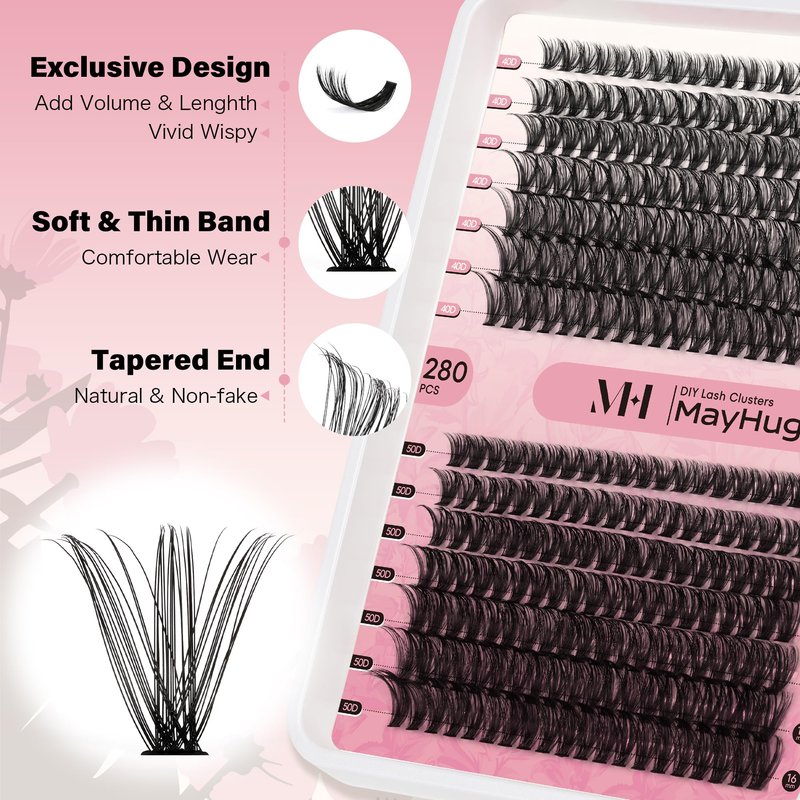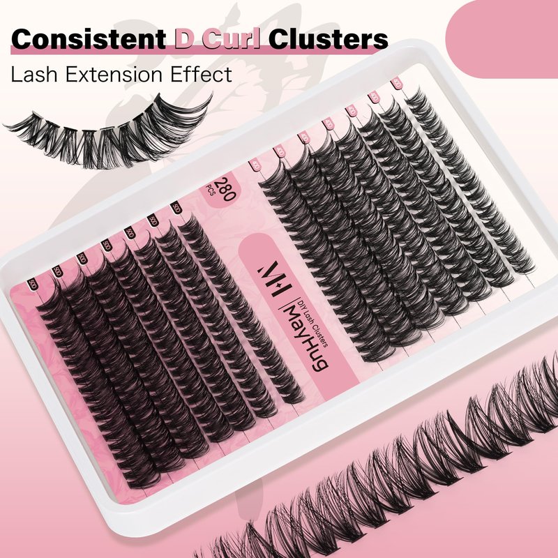 Mayhug Lash Clusters: D curl Style: Fluffy, Common, Natural, Cross, Classic Mixed Length: 9-16 mm Large Quantity: 280 pcs a tray High-Quality Lashes: These eyelash clusters extensions are made from professional artificial mink eyelashes, created by heat-bonding lash clusters for a fluffy effect. Each individual lashes is carefully handcrafted and adjusted for optimal lash results. DIY Eyelash Extensions at Home Just 3 minutes with Mayhug Cluster Lashes. Whether you're new to applying lashes or a seasoned pro, Mayhug makes the process quick and hassle-free, catering to all your daily lash needs. Soft and light, Easy to use. Suitable for most people and match daily or gorgeous makeup. You can according to your own needs, create your own favorite eyelash style by yourself, and simple operation, saving time and money. An exquisite and lovely pack is also a good choice to send your friends as a gift.