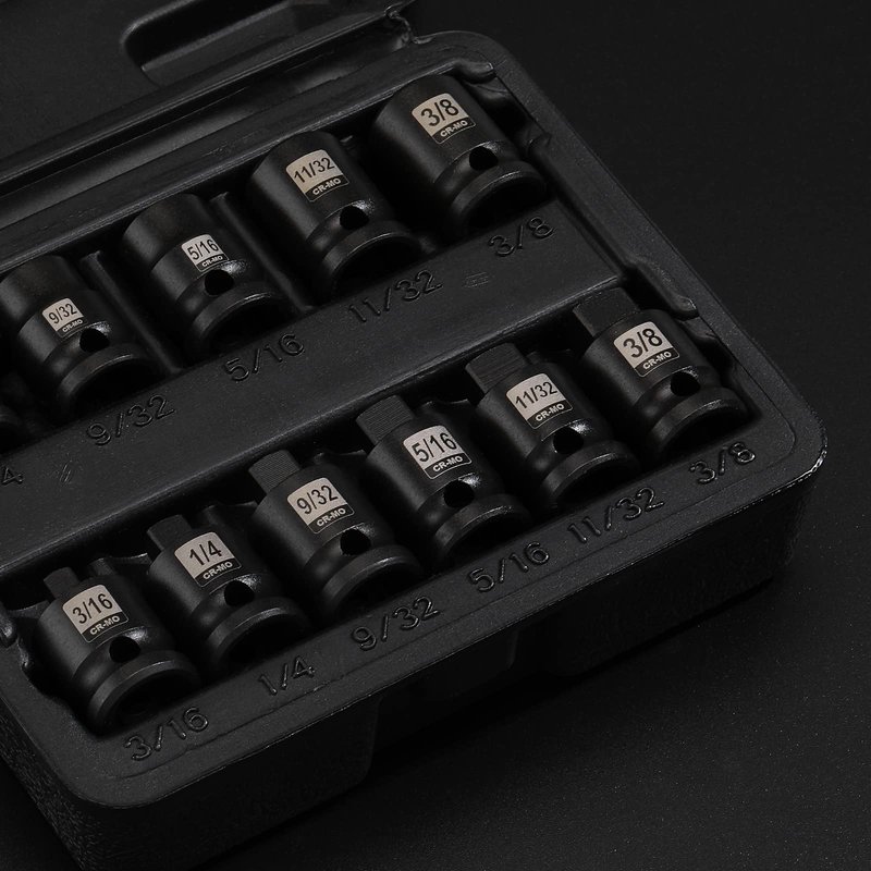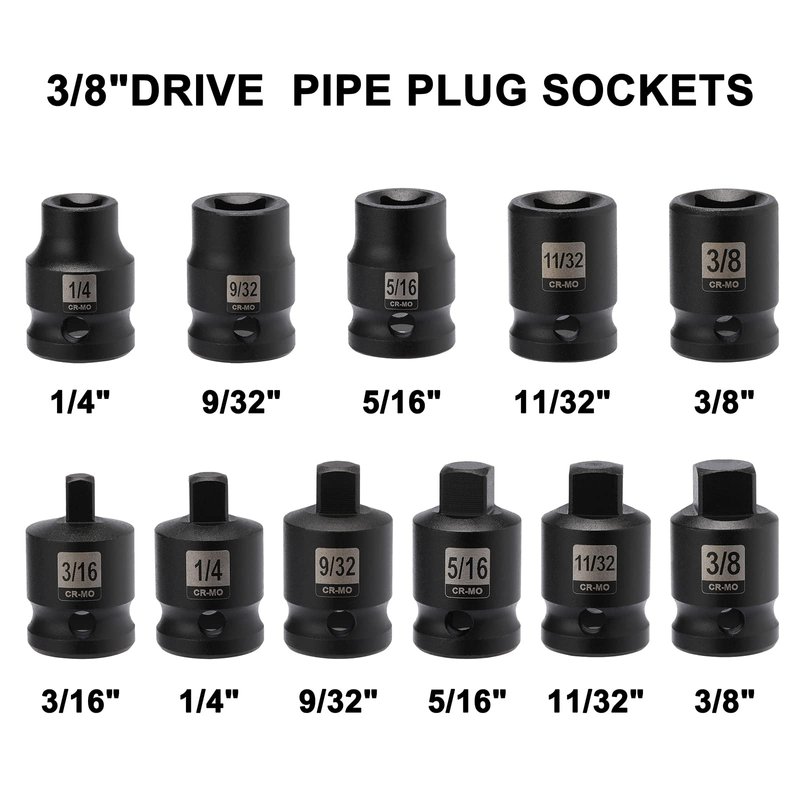- Includes: 11pcs 3/8"drive SAE pipe plug sockets: male: 3/16", 1/4", 9/32", 5/16", 11/32", 3/8" ; female: 1/4", 9/32", 5/16", 11/32", 3/8"