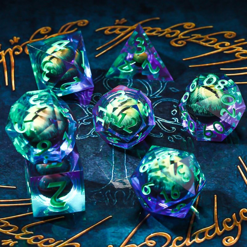 The 7 Piece Liquid Core Eye dice Set that is sturdy and durable, with a quality that will stand the test of time and will stand up to years of use.