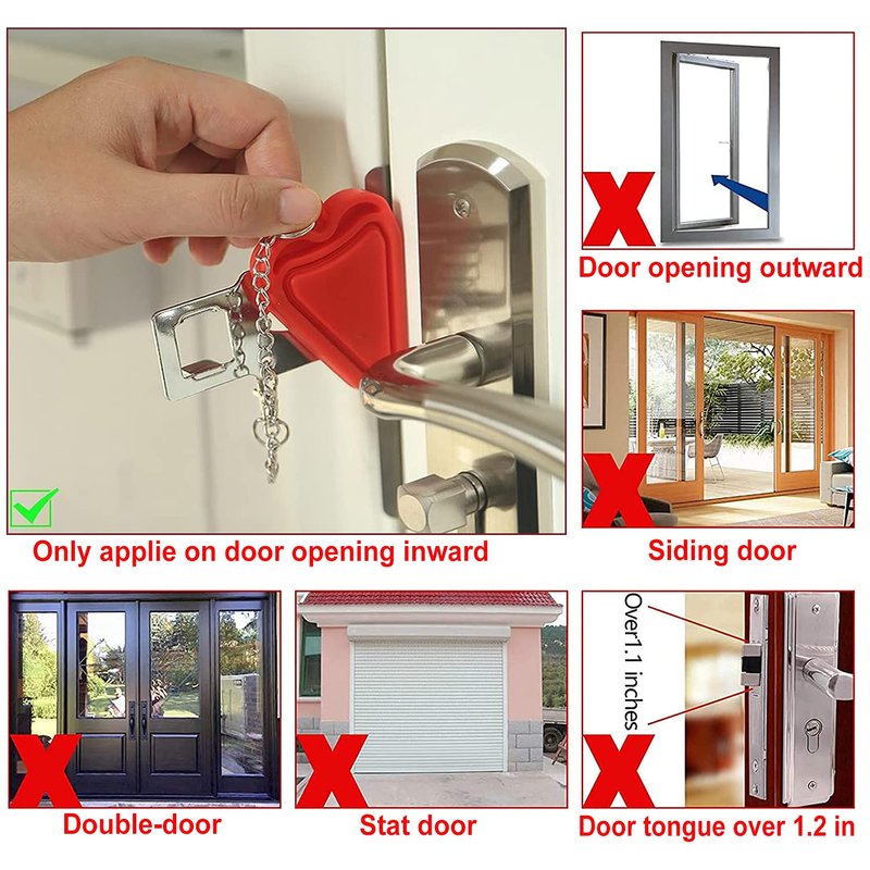 - EASY TO USE: Easy to install or remove, Our Security Door lock Kit can be installed in seconds without any tools, Perfect for hotels, dormitories, apartments, short-term rentals, Airbnbs, bathrooms, bedrooms, or private rooms. It may also be applied to avoid pets going out, and also to prevent children from opening their doors to strangers