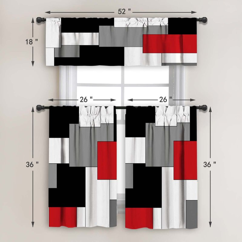 MCALK Red Blackout Kitchen Curtains Tiers and Valances Set 3 Piece for Windows Grey and Black Kitchen Window Curtains Set,White Modern Abstract Art Valances for Living Room(36" Tiers Set)