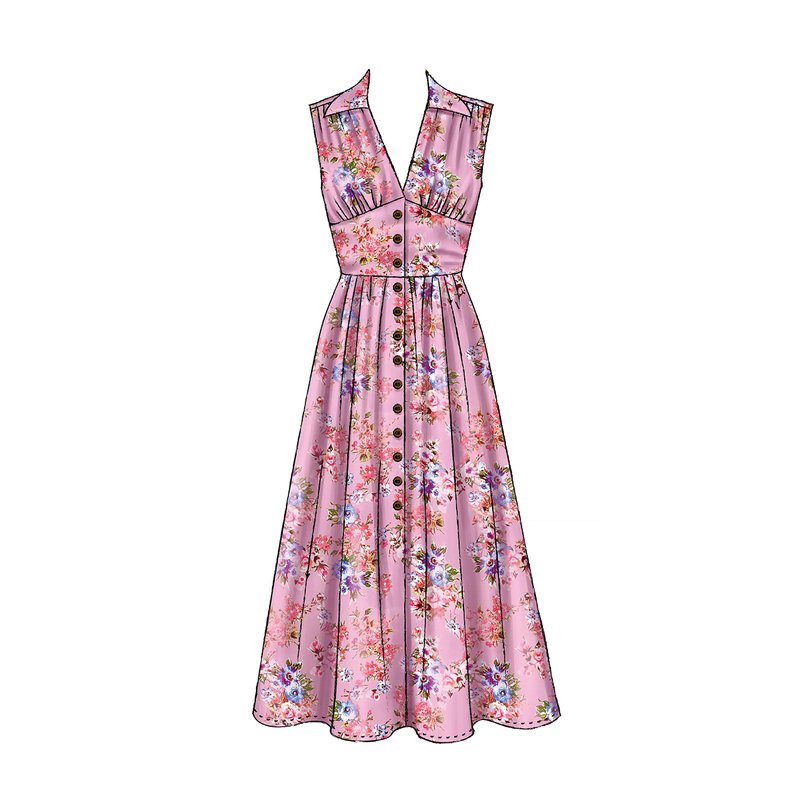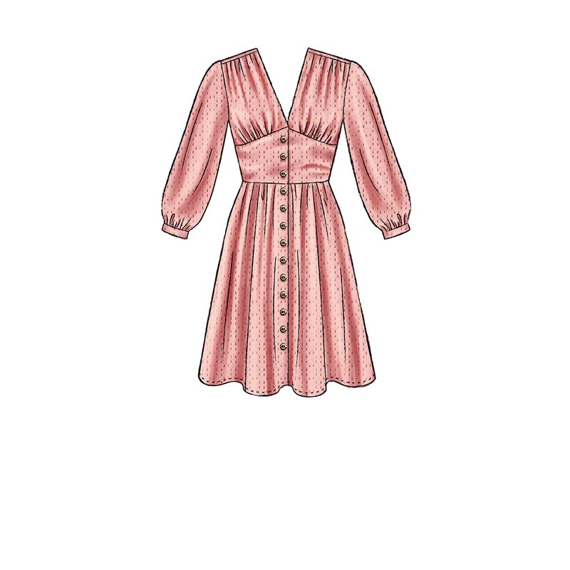 - Buttoned front dress patterns can be made with sleeve and length variations, and each dress includes a fitted bodice with front midriff, back yoke, and gathered skirt with side seam pockets.