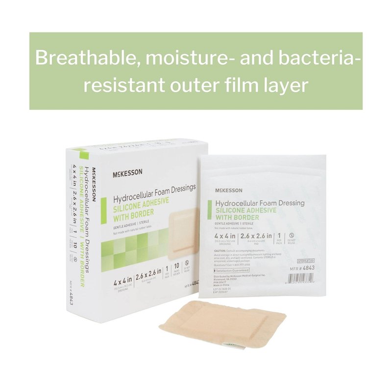 McKesson adhesive silicone foam dressing with border minimizes discomfort to individuals when it's time to remove the dressing. The outer film layer of the dressing resists moisture while remaining breathable.