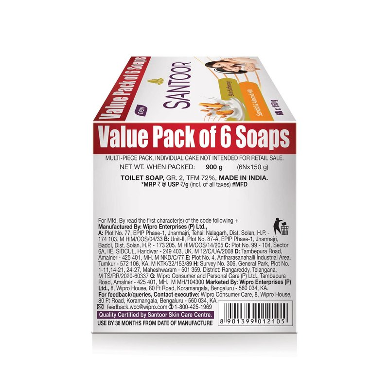 - Santoor Skin Softening Sandal & Almond Milk Bathing Soap with Nourishing & Anti-Aging Properties| For Smooth & Soft and Younger-Looking Skin| For All Skin Types| 150g, Pack of 6