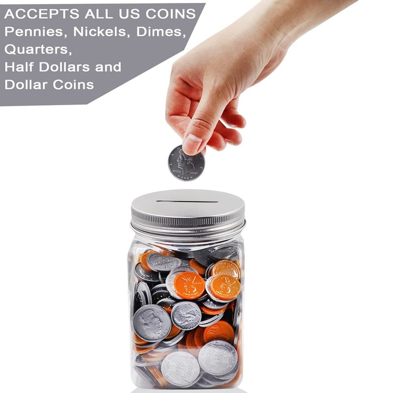 - ❤️Clear Coin Bank: The Silver Coin Bank is Made From Durable, Unbreakable, Food Safe PET Plastic. Compared to Glass or Ceramic Piggy Banks, Our Kid-friendly Plastic Coin Jar is Safer and Lighter than Glass Jars. The Highly Transparent Look Allows You to See the Balance of the Deposit Inside the Coin Saving jar Clearly.