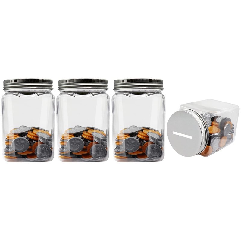 - ❤️Value Pack of 4: You Will Get 4 Plastic jar piggy banks with 4 Slotted Lids for Saving Coins and Money. We Can Holder Four Different Coins or Money at Once. We Can Also Introduce Saving, Spending, Sharing Containers to Children About Many Concepts of Money. Size: 4.5 Inches Tall By 2.9 Inches Width; Capacity: 500 Ml= 16 Fluid Ounces=2 Cups = 1 Pint.