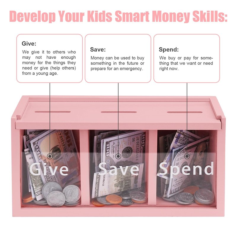 - ❤️Save Spend Give Giggy Bank System: One piggy bank for boys or piggy bank for girls with 3 compartments labeled Spend, Save, and Give for spending, saving and giving to teach your child about budgeting, setting savings goals and the Give section encourages kids to give (help others) from a young age