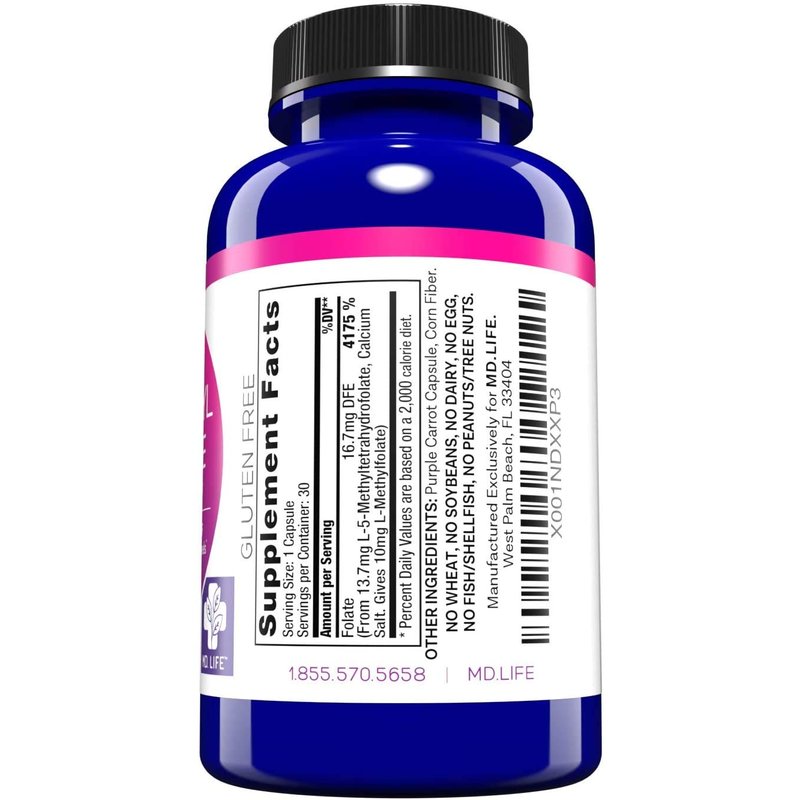 - TRUST IN QUALITY: MD. Life mthfr folate is meticulously designed by experts and manufactured in small batches using superior ingredients. These folate supplements are proudly made in the USA in an FDA registered facility, adhering to GMP certification and undergoing rigorous third-party testing. Rest easy knowing that our products meet the highest standards of safety, quality, and performance.