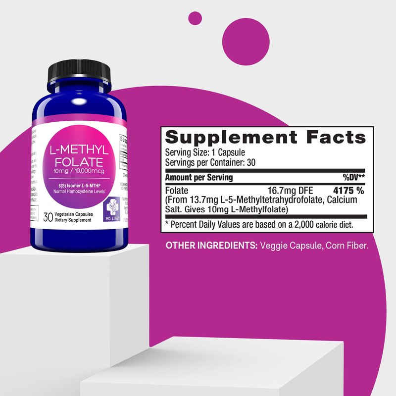 MD Life L-Methylfolate 10mg - Your Professional-Grade Active Methylfolate Supplement Unlock Maximum Bio Absorption: Our L-Methylfolate 10mg is expertly crafted for enhanced absorption. With each dose, you'll experience the highest potency of essential amino acids and methylated folate delivered directly to your system, optimizing the benefits. Unparalleled High Potency: Each capsule is the result of extensive research and development, meticulously designed to seamlessly integrate into your wellness routine. It provides a supplement that harmonizes with your body's natural rhythms. L-Methylfolate 10mg offers the highest potency available, delivering noticeable results. Methylfolate Supplement for Your Health: Our folate supplement is carefully tailored to complement a balanced health approach. It seamlessly integrates into your existing nutrition plan, contributing to overall well-being. Pure and Simple Ingredients: Our L-Methylfolate is GMO-free, gluten-free, and vegan-friendly, ensuring the highest quality folate. This methylated folate supplement contains no fillers, binders, soy, gluten, dairy, eggs, or nuts. It is recommended for use under the supervision of a physician. Trust in Quality: MD. Life MTHFR folate is the result of meticulous design by experts and is manufactured in small batches using superior ingredients. These folate supplements are proudly made in the USA, in an FDA registered facility, adhering to GMP certification standards, and subjected to rigorous third-party testing. You can rest assured that our products consistently meet the highest standards of safety, quality, and performance. Elevate your well-being with MD Life L-Methylfolate 10mg, your trusted choice for professional-grade methylfolate supplementation.
