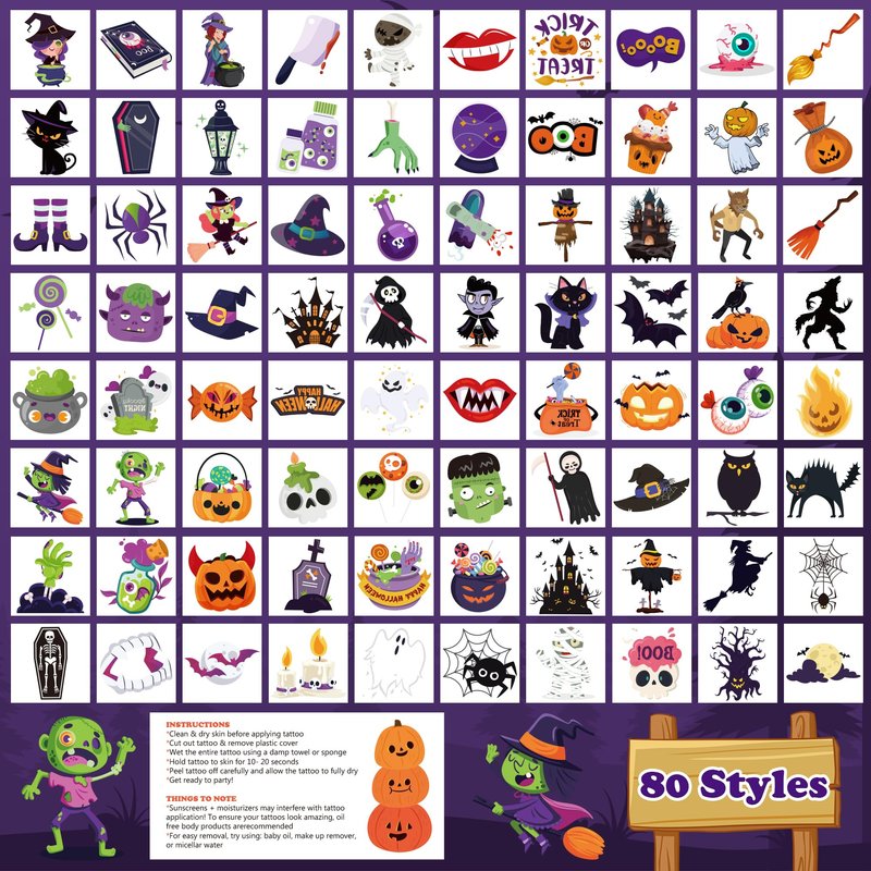 - Kids' Halloween Delight: Let your little ones immerse themselves in the Halloween spirit with adorably spooky Halloween tattoos for kids. Watch their faces light up as they proudly show off their favorite Halloween characters and designs.Halloween party supplies.