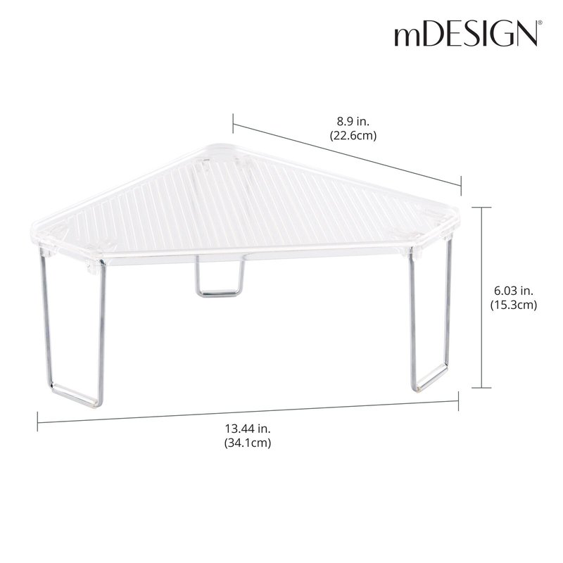 The mDesign Corner Shelf makes the most of the unused storage space on your bathroom counter tops, inside cabinets and under the sink with its space-saving triangular design. It instantly creates two levels of storage making it easy to maximize small spaces by providing double the capacity. Store bars of soap or moisturizing creams below while using the top for body sprays, foundation, compacts, nail polish and remover, cotton balls or swabs and other daily cosmetic or beauty necessities. Stack shelves together for convenient, vertical storage solutions around your bathroom. Shelves fold flat for compact storage when not in use. modern living by Design.