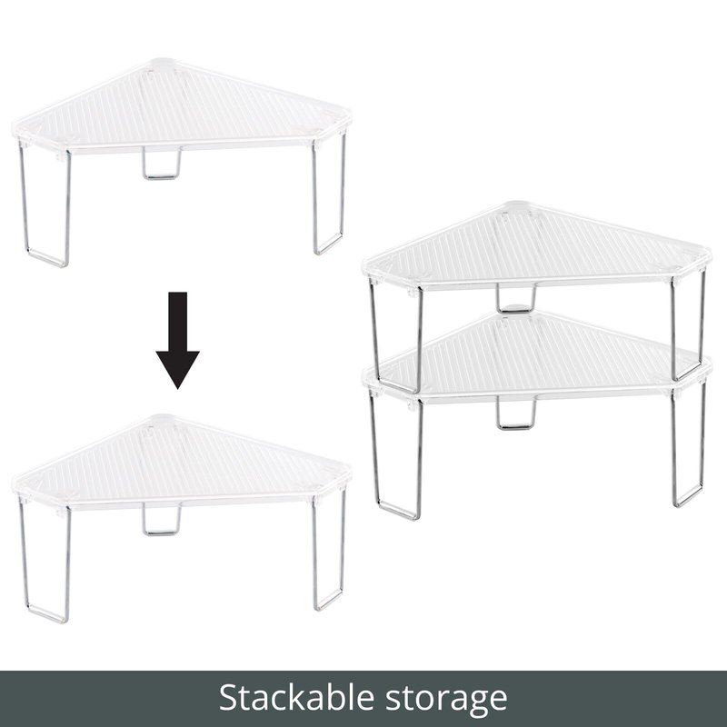 - COMPACT DESIGN: Corner design is ideal for smaller spaces; Non-slip feet keep the storage shelf from slipping, especially when stacked while also protecting your counter surfaces from scratches; Fold the shelf flat for space-saving storage when not in use; Perfect for apartments, condos, dorm rooms, RVs, cabins, campers and cabins