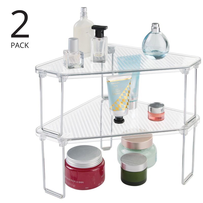- STACKABLE STORAGE: Corner storage shelf organizes small and crowded bathroom areas; Corner design maximizes unused space; Place on vanity countertops, in cabinets and under the sink; One unit provides two levels of storage to let you store and organize creams, extra soap bars, hand lotion, face creams, hair spray, makeup, powder, perfumes, body sprays and other cosmetics; Items are always at the ready when you need them; Shelf is stackable to create vertical space-saving storage; Set of 2