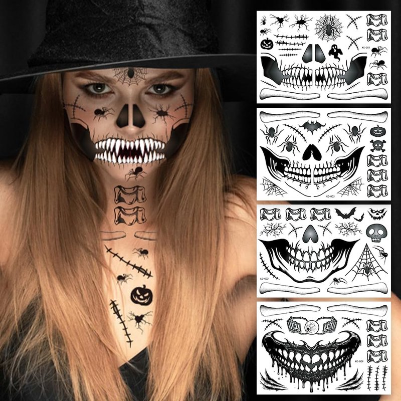 - Packing: You will receive 4 pcs skull tattoos, and our Halloween face tattoos each pattern is unique, and seems very realistic and natural. These various pattern tattoos meet your Halloween makeup needs