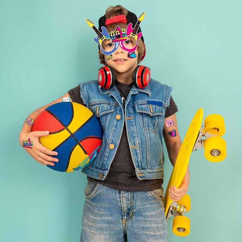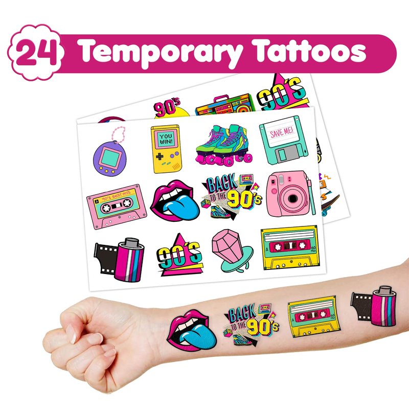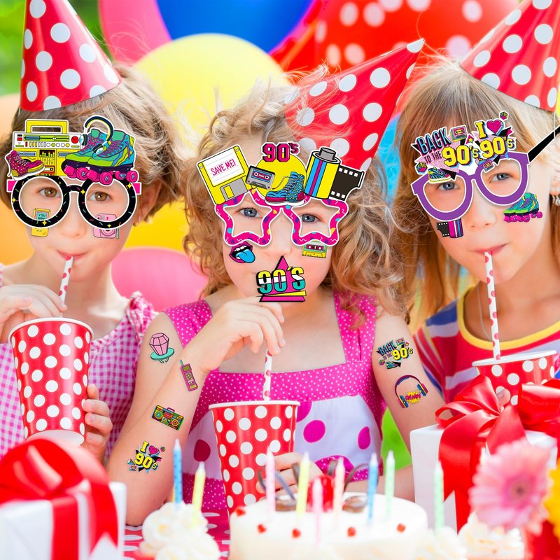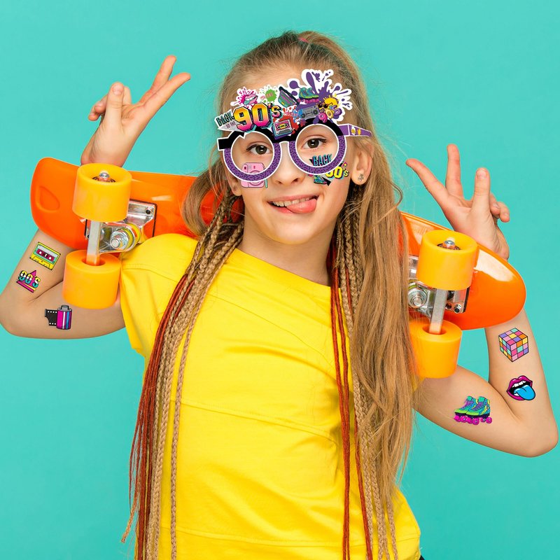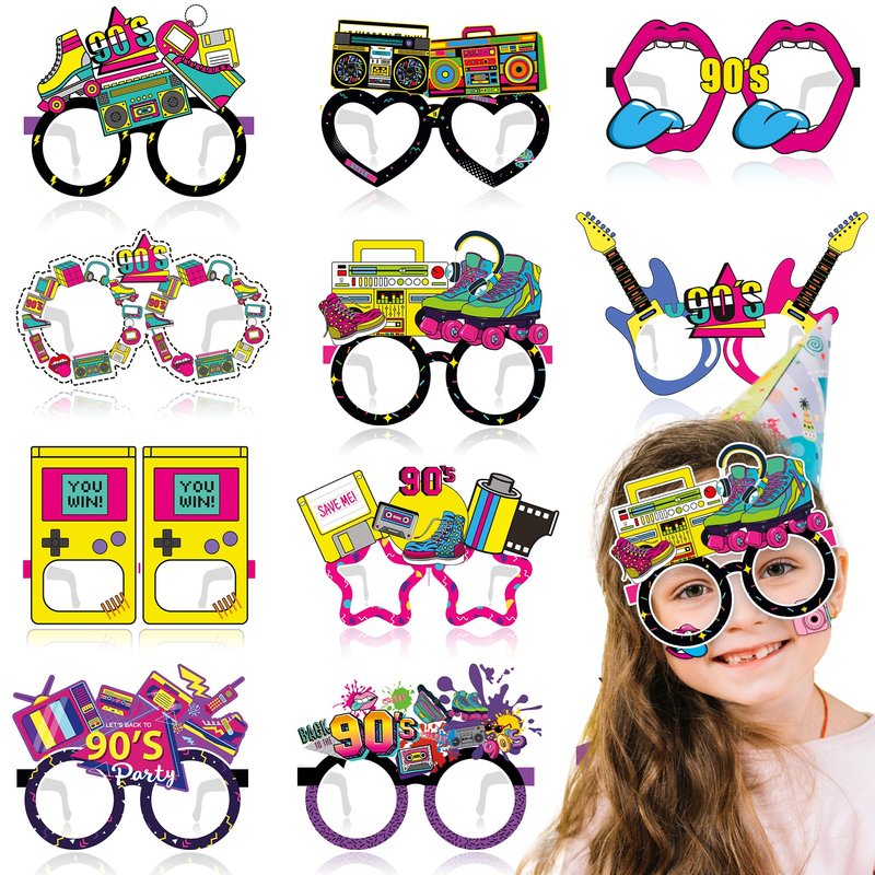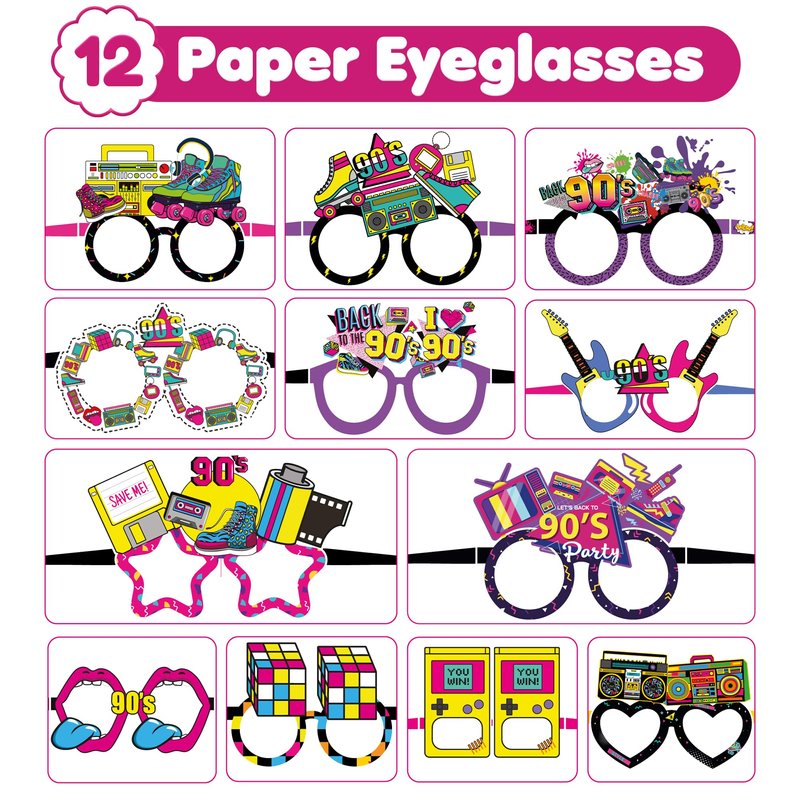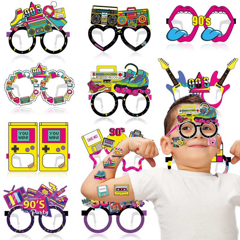 - 🌟 Introducing our groovy 12PCS 90s Paper Eyeglasses and 24PCS 90s Tattoos Stickers set, perfect for adding a nostalgic vibe to any occasion! Step back in time with these rad eyeglasses, each adorned with captivating 90s-themed designs. From neon colors to retro patterns, our eyeglasses feature a variety of iconic motifs that are sure to transport you to the era of grunge and hip-hop.
