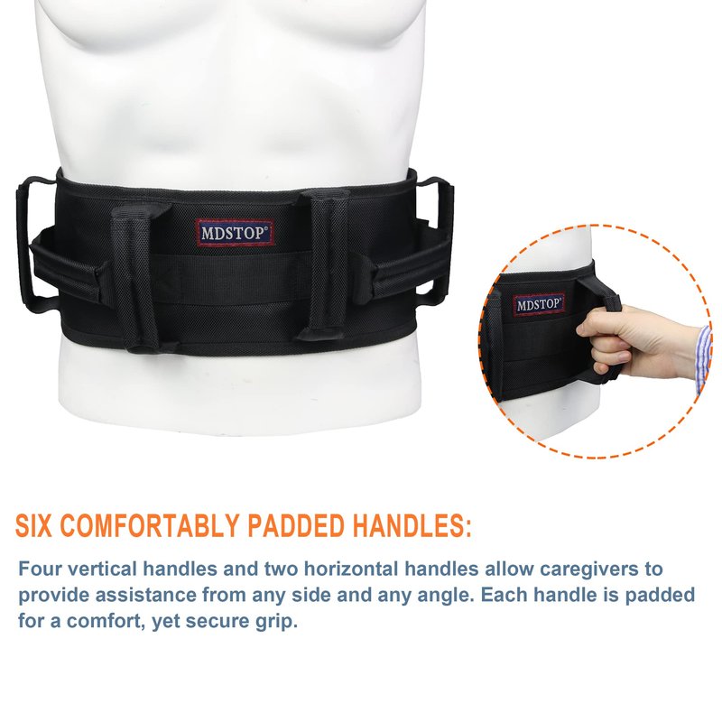 - Easily Move And Transfer: This upgraded gait belt features 6 soft padded sponge handles. 6 ruggedized handles provide caregivers a safer and more effective assistance from any angle when transfering patients. Prevent falls and other embarrassing situations safely and put an end to grabbing loved one painfully by the arm or by the seat of the pants.