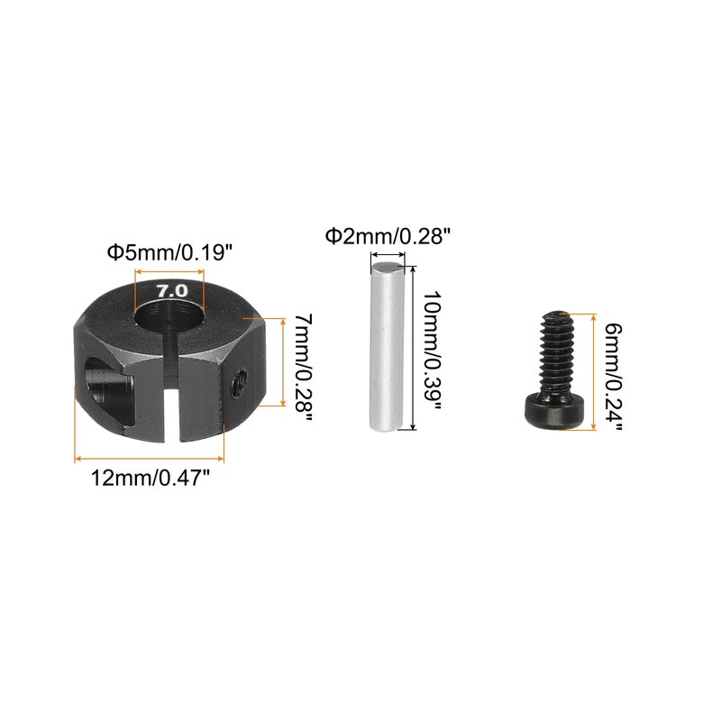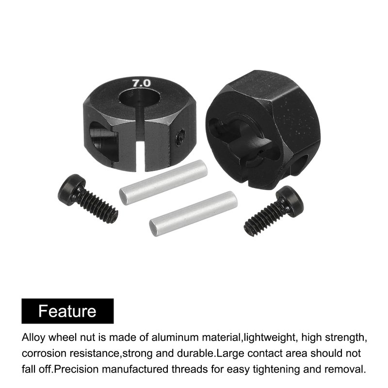 - Aluminum RC Wheel Nuts ,is in size of:Hole diameter:5mm/0.2 inch;Length of opposite side:0.7cm/0.28 inch;Nut outside diameter:12mm/0.47 inch;Thickness:7mm/0.28 inch;Pins:10x2mm/0.39x0.08 inch(L*D);Screws length:6mm/0.24 inch;Color: Black;Material: Aluminum;In the package of(12PCS): 4 x RC Screw Wheel Nuts;4 x Pins;4 x Screws;