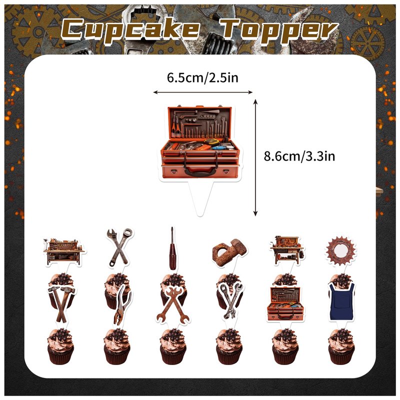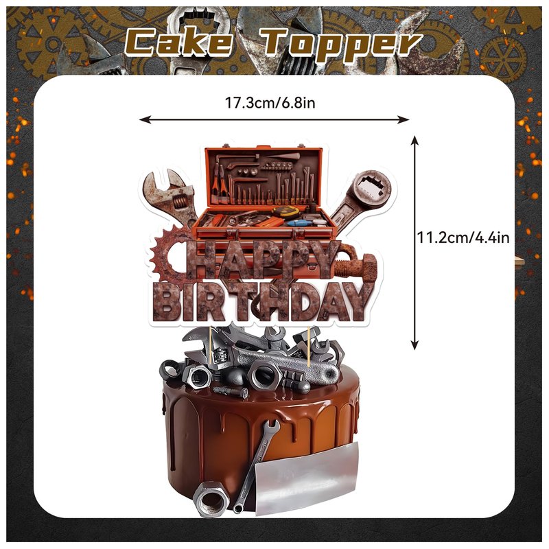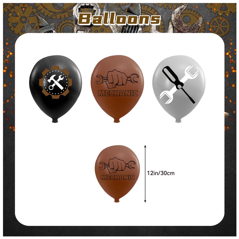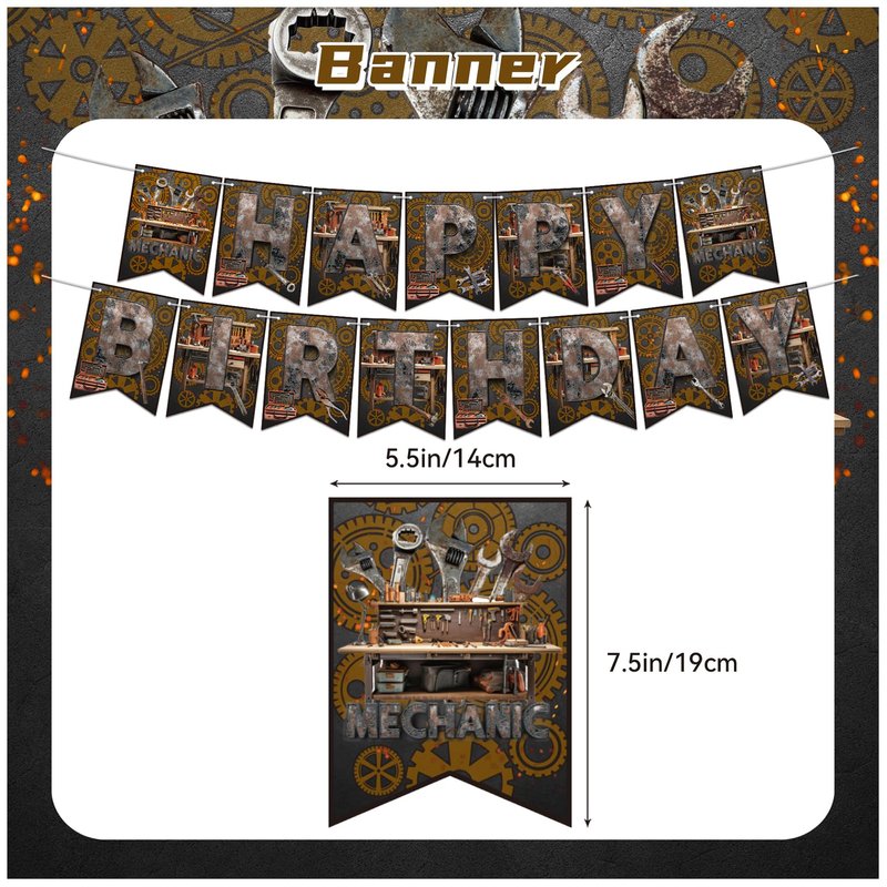 - Mechanic Party Supplies: You will get 1 mechanic HAPPY BIRTHDAY banner, 1 mechanic HAPPY BIRTHDAY cake topper, 12 mechanic cupcake toppers, 18 mechanic balloons (6 black, 6 brown, 6 gray), 1 ribbon.