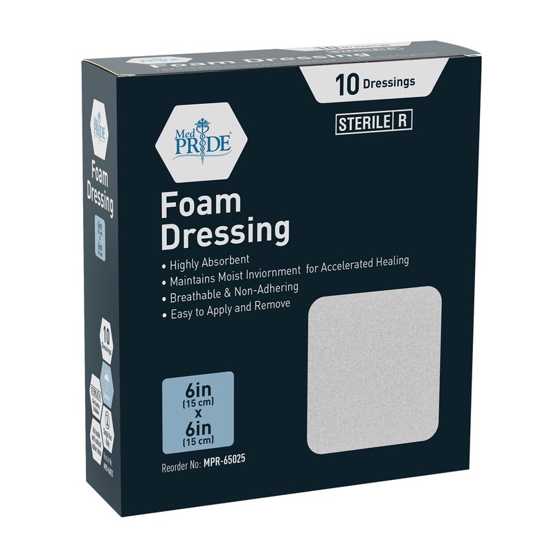 MED PRIDE Foam Dressings -10 Pack, 6'' x 6'' - Sterile, Hydrophilic, Highly Absorbent- Soft, Non-Adhesive Pads, Waterproof Dressing for Wound Care & Ulcers, Post Op Trauma + Injuries