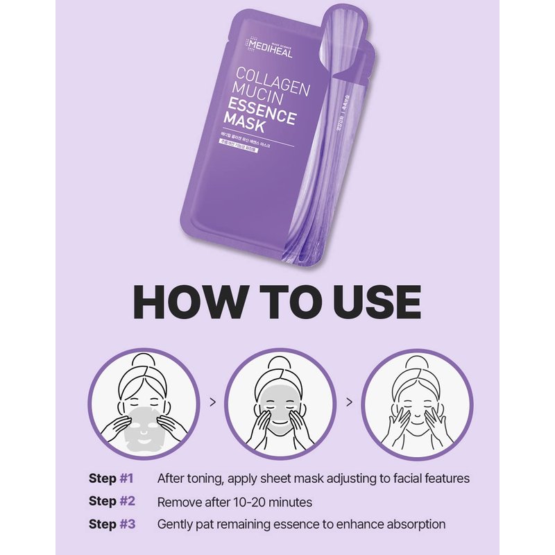 - KIN FRIENDLY CELLULOSE SHEET MASK: Mediheal Collagen Mucin Essence Mask is specially formulated using plant-derived cellulose that evenly spreads and adheres to the skin. This soft fabric sheet mask contours the skin for maximum absorption of nutrients and enhanced effects.