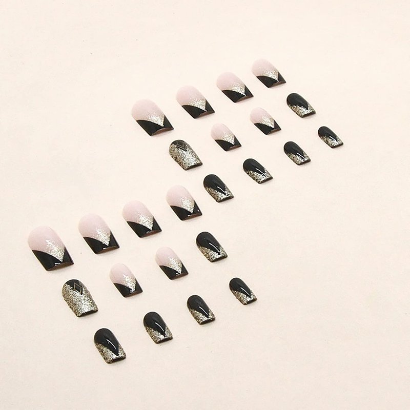 24Pcs Black Medium Press on Nails with Gradient Gold Glitter Designs Fake Nails Set for Women Manicure Decorations