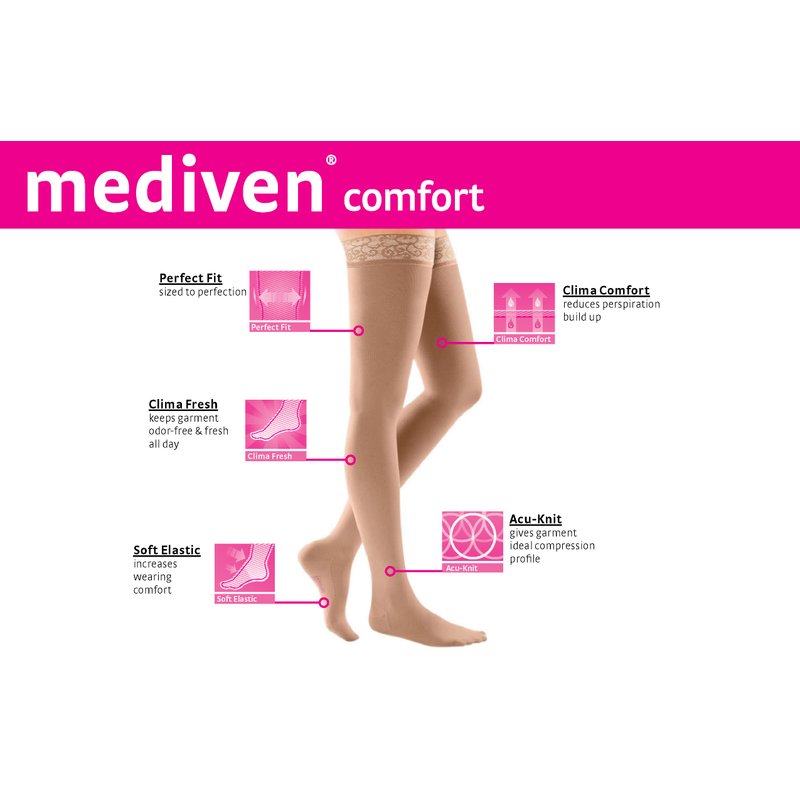 - COMPRESSION STOCKINGS FOR WOMEN: Featuring 20-30 mmHg compression in a thigh-high style, experience a soft compression stocking with a silicone top band. mediven comfort for women provides comfort and is easy to put on and remove.