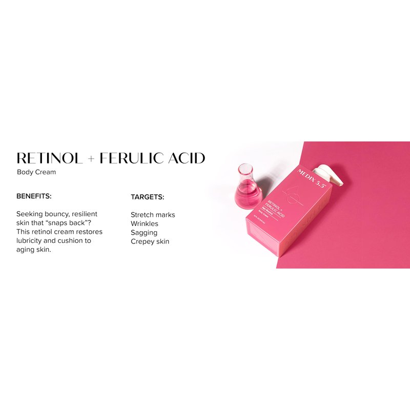 - EFFECTIVE ANTI-AGING INGREDIENTS – Medix 5.5 Retinol Cream is infused with Ferulic Acid, Shea Butter, Vitamin E, & Green Tea, which all work together to effectively firm skin + reduce the appearance of sun damaged skin, wrinkles, fine lines, & crepey skin. Aloe Vera defends against visible redness & irritation. Green Tea + Chamomile guards against environmental damage & reduces puffiness. Combination of ingredients make this Retinol Body Cream non-irritating unlike many other retinol products.