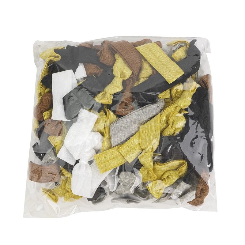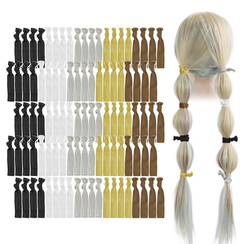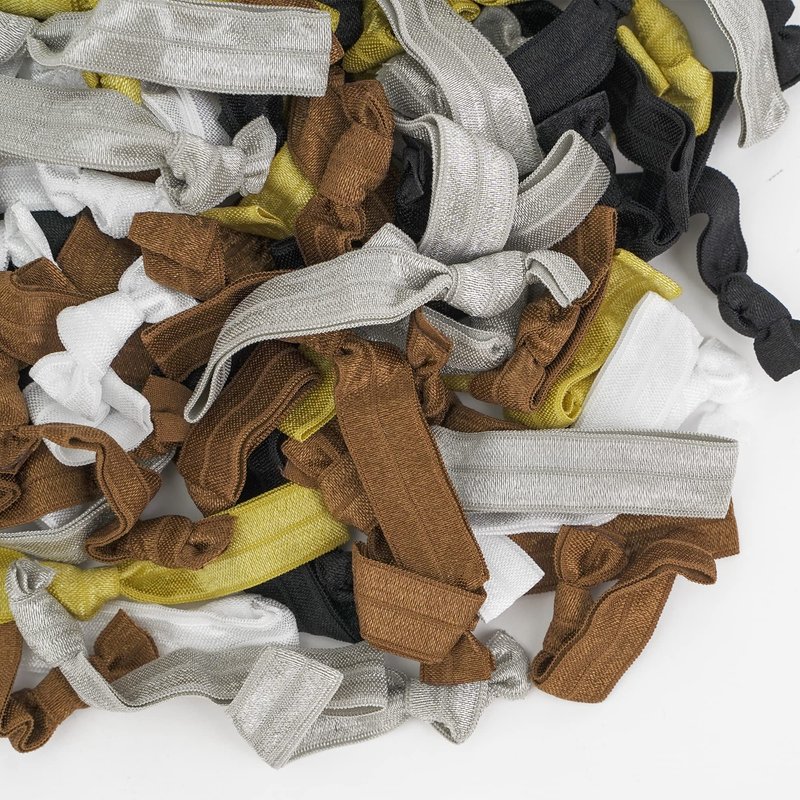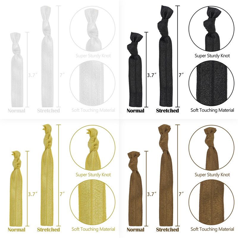 - 🎀️ Our neutral color package contains 100 pack solid color hair ties, 5 different colors with 20 pack of each white, black, silver, brown and gold color. Our hair ties are made of very soft fold over elastics with a satin look finish. Each hair tie measures approximately 3.7 inches in length (including the knot), when laid flat, allowing you to store an unused band comfortably on your wrist.