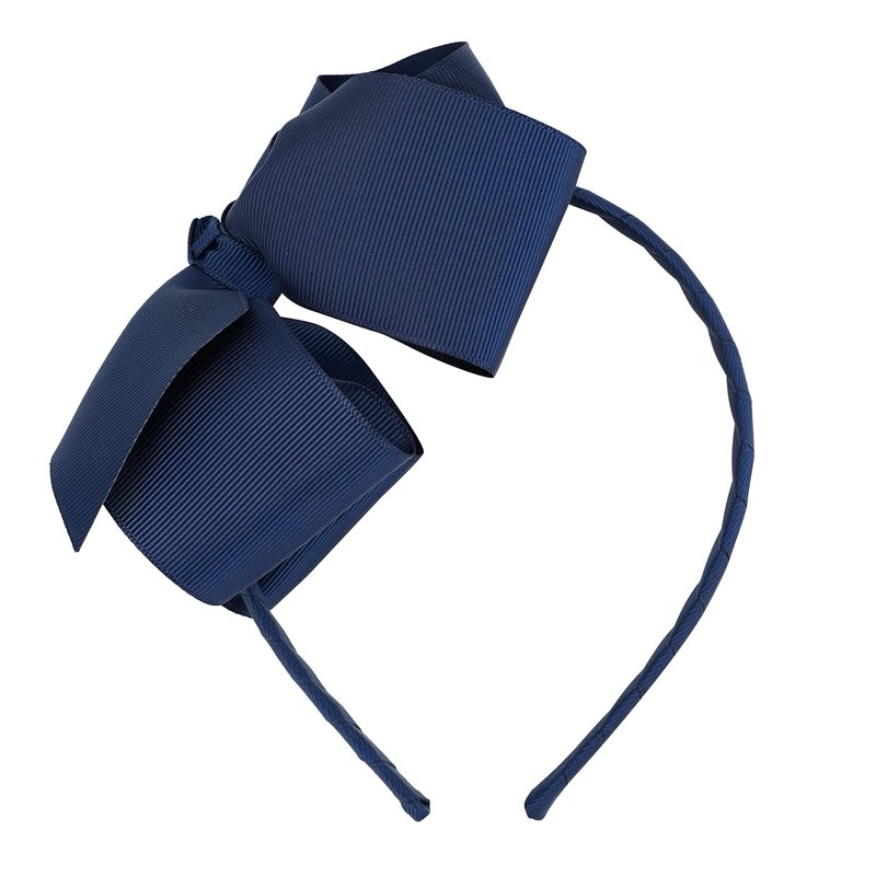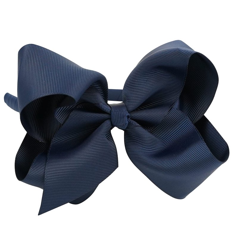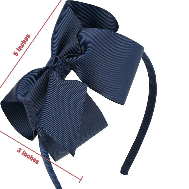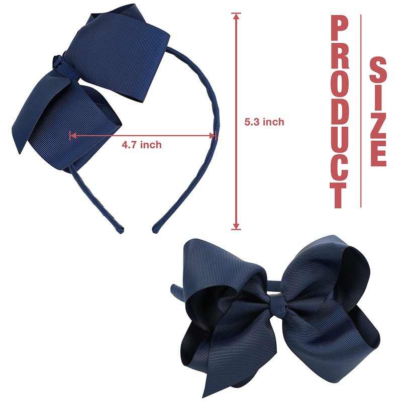 - Package comes in: 1 PCs NAVY big bow headband, approx size: 4.7" x 5.3" (L*W), bow size: 5" x 3" (L*W). Large grosgrain boutique bow on a grosgrain covered hairband. The size " large " indicates the bow size and not the hairband size. Our ribbon used is OEKO-TEX approved and the hairband contains no metal.