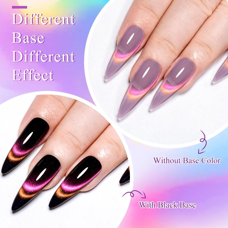 - šćWide ApplicationćGlass magnetic cat eye gel nail polish set can make galactic effect, auroras effect, black hole effect on your nails when match with different base gel. Also reflects different dazzling colors from different angles. A beautiful gel polish for your nail art collection.