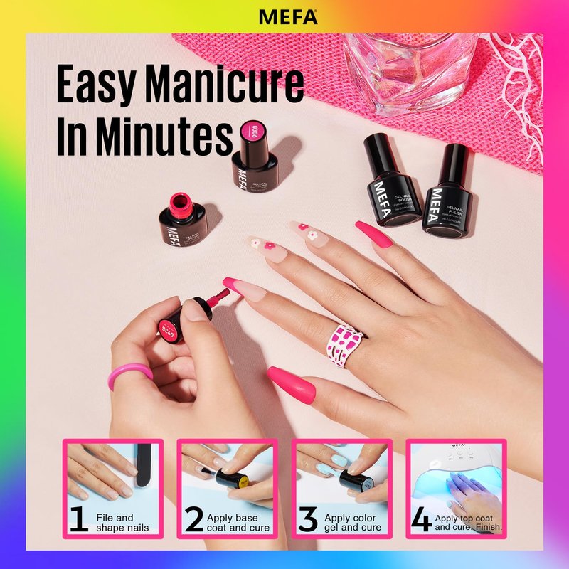 - Easy Application: Enjoy smooth application with MEFA bubble-free rainbow bright sparkle gel nail polish formula. High color payoff and a nail brush designed for precise nail coverage ensure flawless results every time. With gel nail colors that glide on effortlessly and self-level for a seamless finish, achieve professional-looking summer fashion nails with ease.