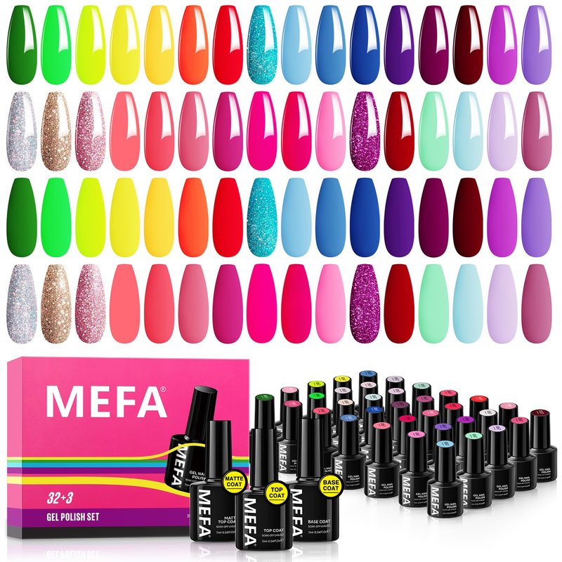 - Summer Neon Gel Nail Polish Set: Dive into the vibrant hues of summer with MEFA 32 colors * 7ml neon nail gel kit. Featuring 1 * 7ml glossy top coat, 1 * 7ml matte top coat, and 1 * 7ml base coat, this gel nail polish set captures the essence of the 2024 summer season. With a rich array of colors including red, orange, yellow, green, blue, and purple, our rainbow spectrum ensures endless nail art possibilities.